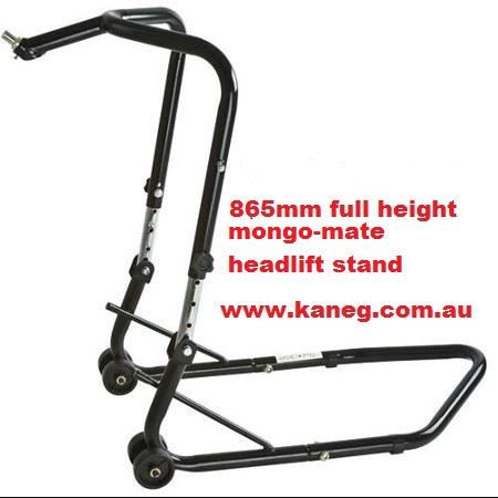The Mongo-Mate is a Steering Head Lift Stand, which is placed on the centre-line of the bikes steering head to even up the weight distribution and to allow for easy: